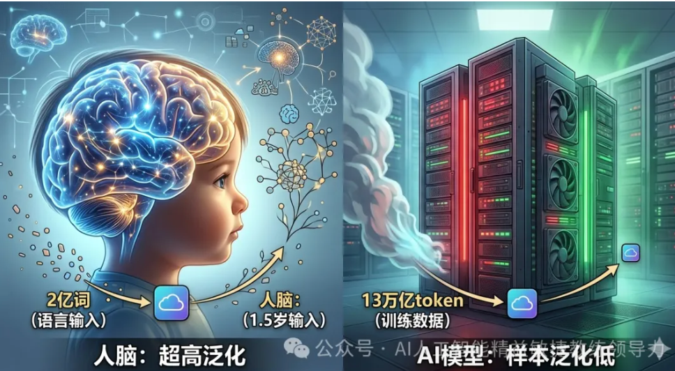 它的记性太死,你的记性太活: AI 需要吞掉 13 万亿个数据才能学会说话,而人类孩子只需要接触 2 亿个词就能搞定。 为什么?因为你脑子里自带 5 亿年进化的“外挂”,比如婴儿天生就会认人脸,那是“出厂预装”的先验知识。