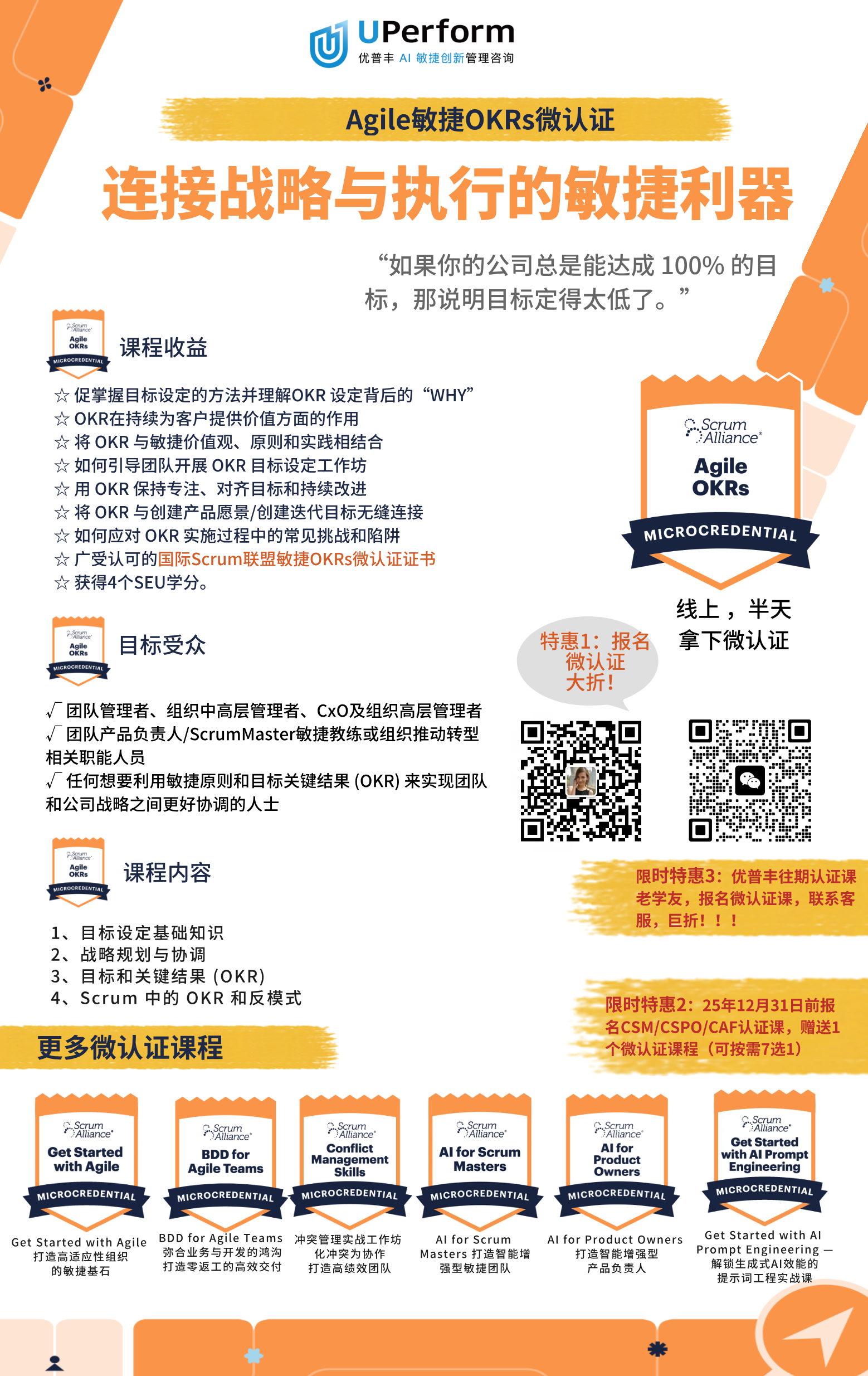 OKR 是敏捷工作方式中常用的一种目标设定方法和系统,可帮助团队围绕共同目标进行协调并跟踪实现这些目标的进度。这是一个四小时的强化课程。